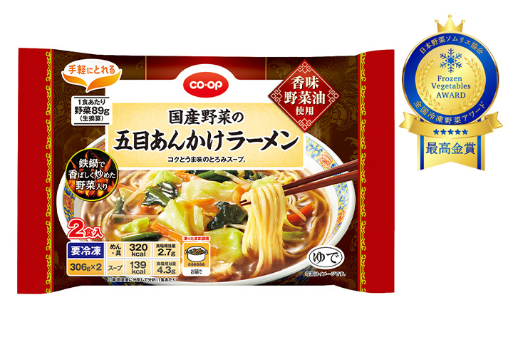 生協の組合員から要望で国産野菜にこだわった五目ラーメンです。 7種の国産野菜(キャベツ、もやし、にんじん、たまねぎ、ほうれん草、にんにく、しょうが)を鉄鍋でシャキシャキと香ばしく炒めました。麺は茹でのびしにくく歯ごたえのある細麺を使用しました。お鍋一つで簡単に調理ができます。 また、お鍋で調理することで、炒めた野菜のうま味と香ばしさがスープに溶け出し、麺にしっかり絡むことでおいしく仕上げています。香味野菜油でさらに味わいをプラスしており、中華料理店のような味わいに仕上げた「こだわり」の五目あんかけラーメンです。 (日本生活協同組合連合会 第一商品本部冷凍食品部 部長 碓田晃司様)